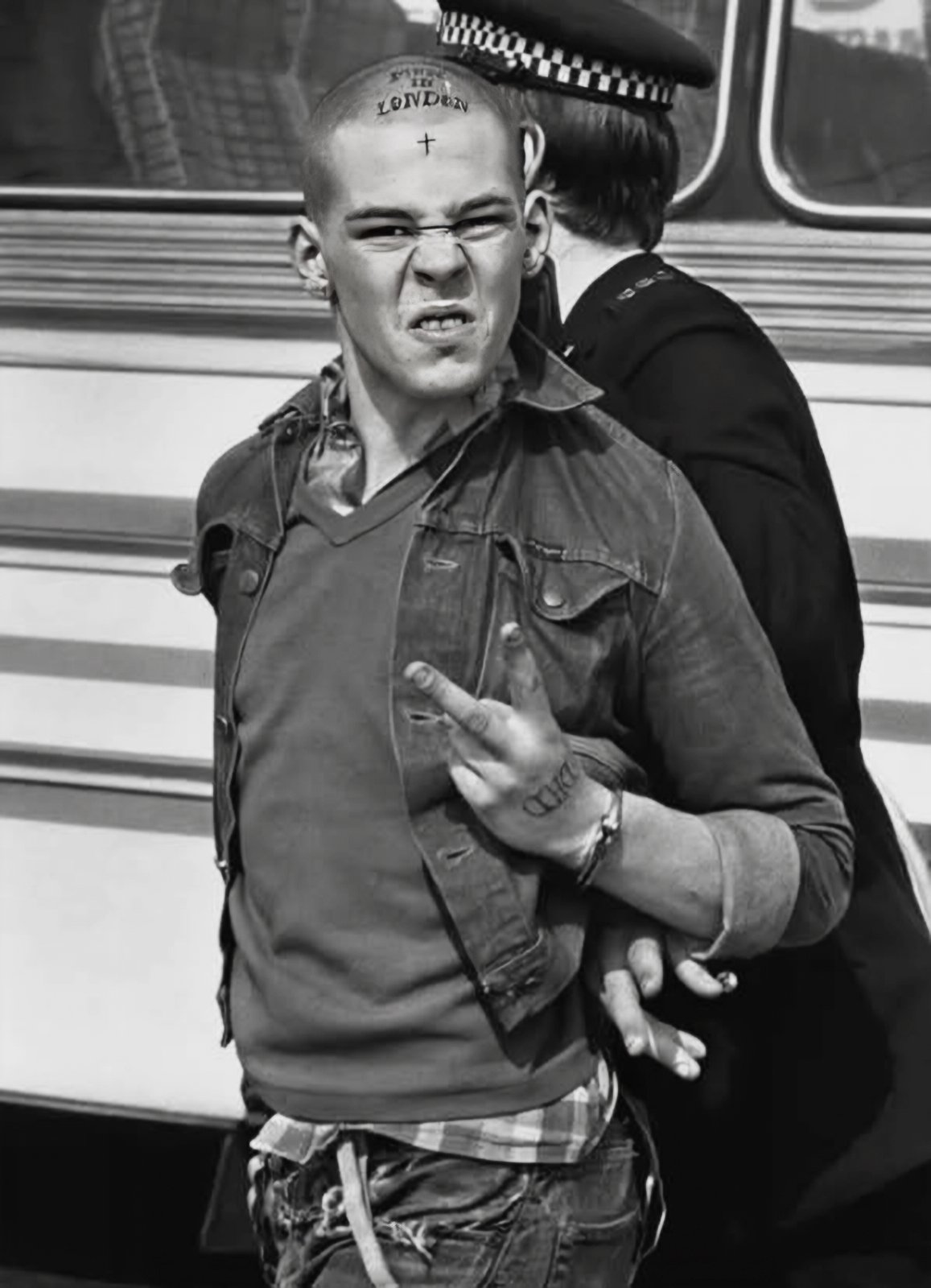 A skinhead is escorted away by a police officer in 1980. The words ‘Made in London’ and a cross are tattooed on his shaved scalp. (Photo by John Downing)