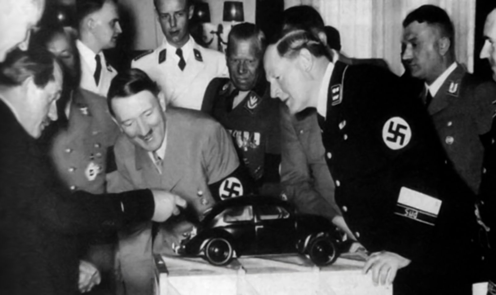 Ferdinand Porsche (yeah, that Porsche) showing a model of the Volkswagen Beetle to Adolf Hitler in 1935.