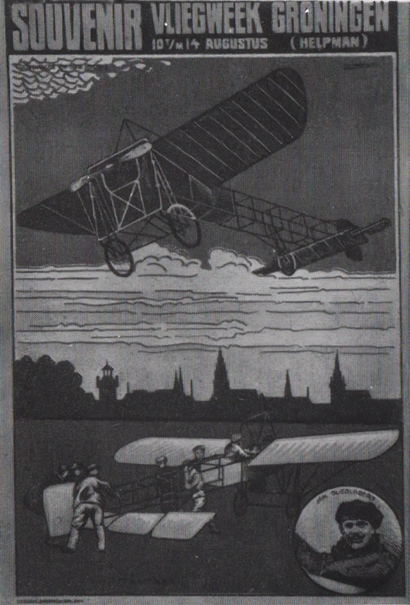 toen een ballon van de Franse kapitein Julhes in de stad opsteeg, één dag na de in Groningen zo bekende 28 augustus. Het is al 1910 als we melding maken van het eerste Groninger ‘echte’ vliegfeest. Jean Olieslagers kwam en de mensen stroomden van heinde en ver toe. Zo groot was het enthousiasme, dat, althans volgens Olieslagers, ‘dames uit de hoogste standen’ hem lastig vielen om hem een klein voorwerp mee de lucht in te geven om dit later als amulet te dragen. Het vliegfeest was zo’n groot succes, dat ook het jaar erop een soortgelijk festijn werd georganiseerd, o.a. met George Legagneux met z’n Bleriot, waarbij zelfs kaarten als souvenir werden uitgegeven.