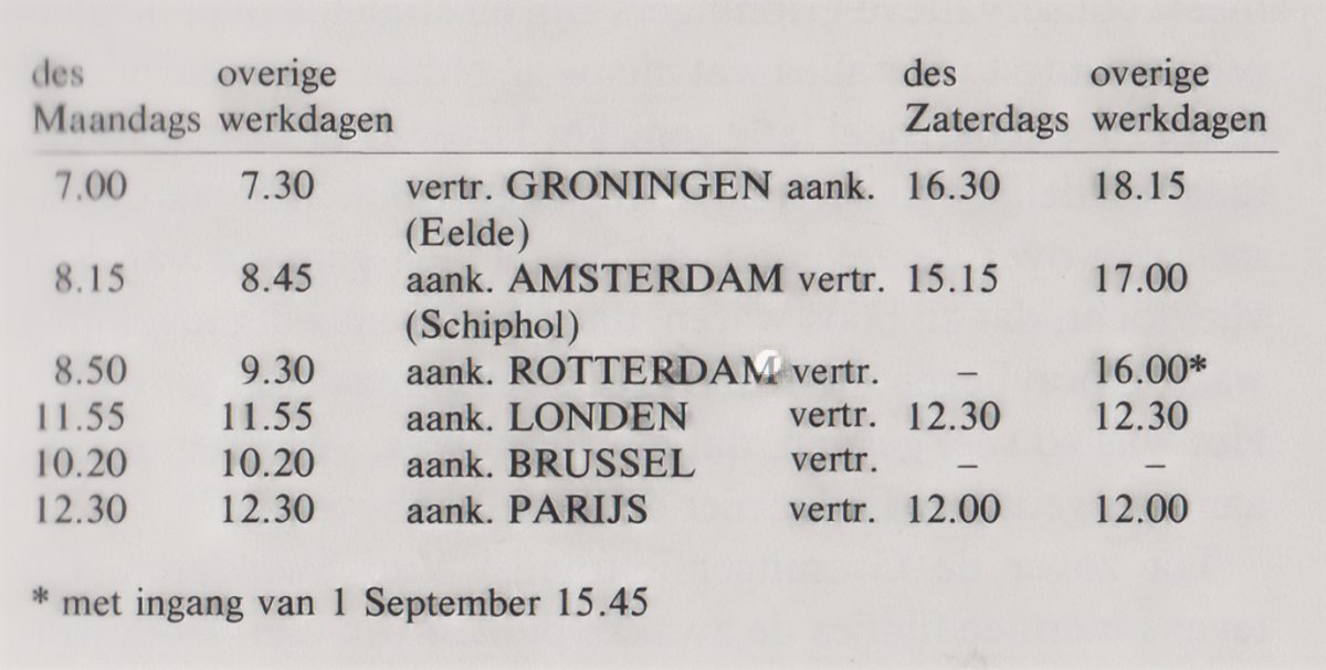 geannuleerd. Dit viel bij de Raad van Bestuur van Eelde in slechte aarde, ze achtte het ontoelaatbaar ‘daar het publiek er persé op moet kunnen rekenen, dat wil men vliegen, op de gegeven lijnen een toestel aanwezig is . ..’.