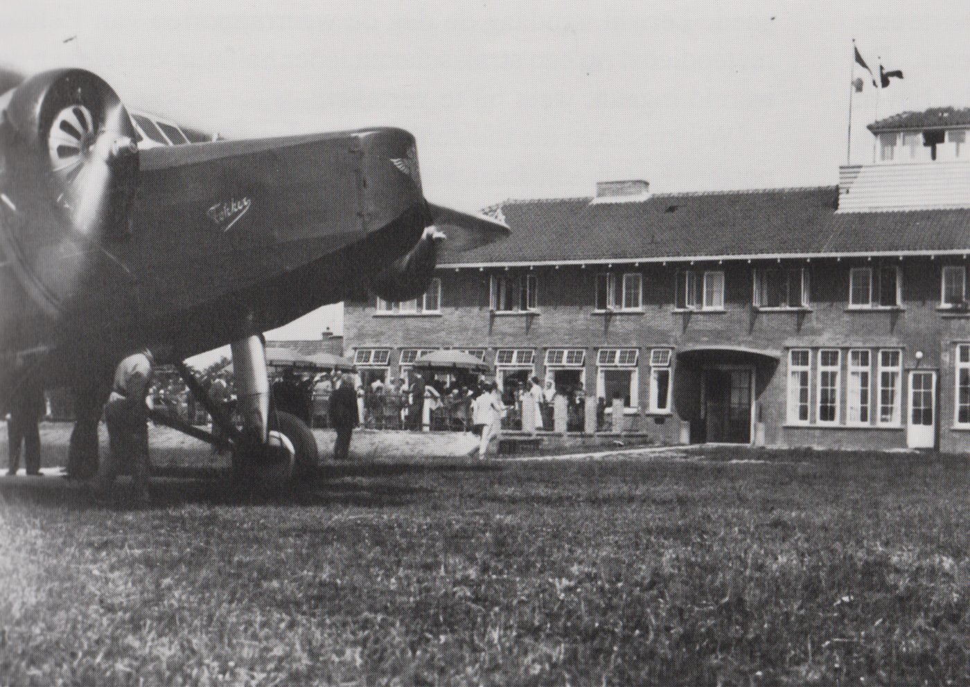 ‘Bij het seinen vroeg ik me af: hoe heet ik? PH . . .? Groningen bracht me op de G, zo is het PHG geworden.’ Hoe de verhoudingen in het begin van de dertiger jaren lagen, blijkt wel uit een grap, die het Eelder personeel uithaalde met een van de bekendste KLM piloten uit die tijd. Deze vlieger was kennelijk nogal ontevreden over Eeldes sanitaire voorzieningen, zodat hij voor een ‘grote boodschap’ gebruik maakte van … de bosjes. Vogelzang: ‘We hebben toen een of andere feestelijke vlucht georganiseerd, de honderdste of zo. Piet Weiman, de mecano, had een mooie foto gemaakt van de bewuste vlieger net op het moment, dat hij in de bosjes zat. Die foto hebben we ingelijst en toen de vlieger voor die zogenaamde honderdste vlucht binnen kwam werd er vanaf de tapkast een briljante speech gehouden. Hij was werkelijk ontroerd en ik zie hem nog met zijn dikke vingers het papier open maken. Toen hij zag wat het was, was het voor ons: waar is de nooduitgang. Een halfjaar later was ik te gast bij het jubileum van de stationschef in Vlissingen, toen onze vlieger daar binnen kwam. ‘Wat hebben ze mij tóen te grazen genomen’, zei hij. Interessant en tekenend is de reaktie, die de NNAC kreeg op een verzoek om in haar clubgebouwtje een buffet te mogen inrichten.