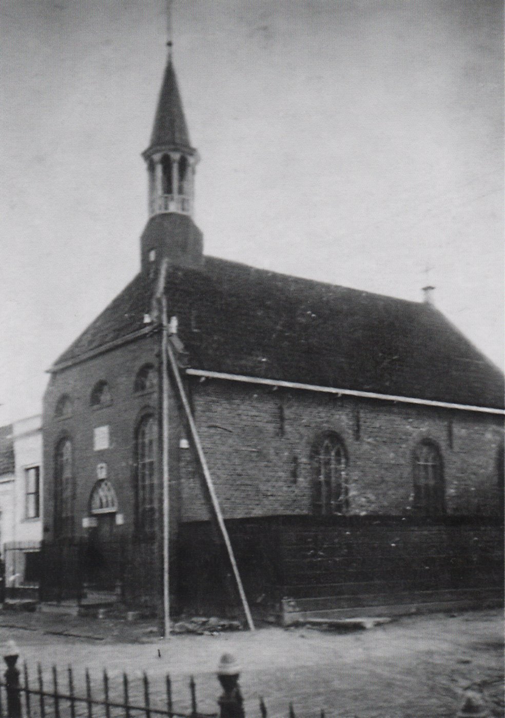 De kerk lag op een eiland buiten de schans. Op de voorgrond de brug over de oude gracht.