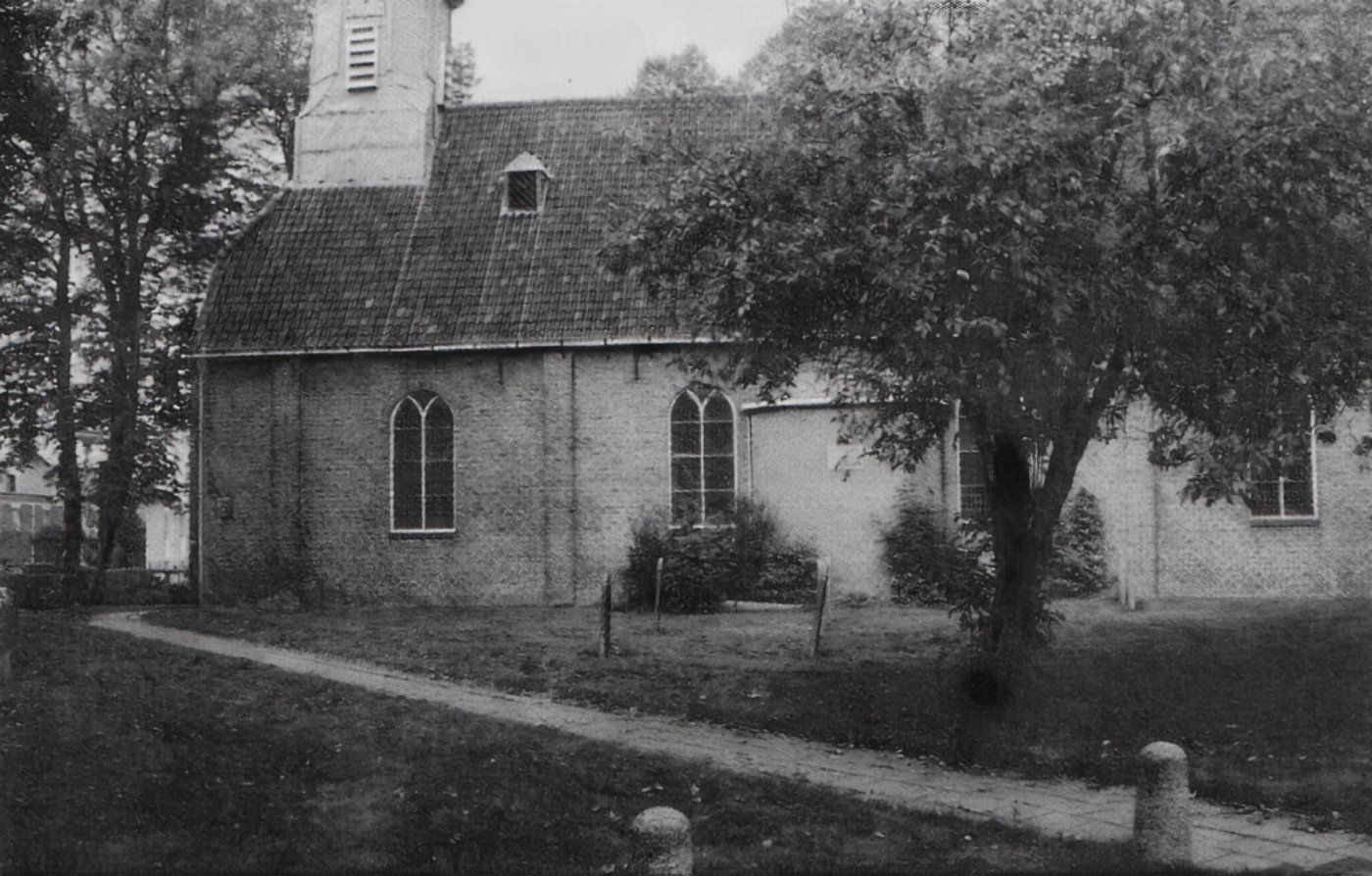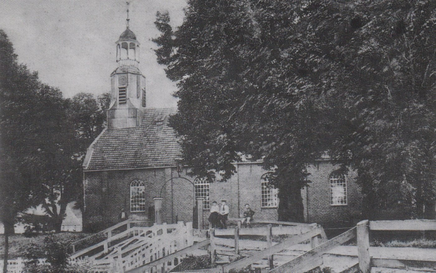 De kerkdeur staat open. Ze zijn binnen aan het schoonmaken zodat we een kijkje in de kerk kunnen nemen. De kerk is langwerpig vierkant en aan ieder eind is een deur. Er staat een torentje bovenop. Direct bij de deur is een portaal met een zoldertje erboven en daar staat het orgel op. In de kerk zijn drie rijen banken en de preekstoel staat in het midden tegen de muur. Aan het andere einde van de kerk is ook een portaal en daarboven is een zolder met twee rijen banken. Die zolder heet ‘klunderbeun’ (galerij) en daar zitten de soldaten. Want die moeten, of ze willen of niet, zondags naar de kerk. Een trap in de hoek van de toren leidt naar het zoldertje waar het klokketouw hangt. Ze luiden de torenklok zaterdags om vijf uur. Dat betekent dat er zondags een preek is. Ook wordt er geluid bij het begin van de kerkdienst en als er iemand begraven wordt. In de toren is een uurwerk en de klok slaat op volle en halve uren, maar hij is nog wel eens in de war. Nu ik de ‘klunderbeun’ noem, schiet mij een grap te binnen van een jaar of wat geleden. Onze koning was toen juist op zondag jarig. De oude dominee had nog meer dan gewoonlijk voor het koninklijk huis gebeden (hij was heel erg oranjegezind) en even voordat de kerk uitging, verzocht hij de gemeente