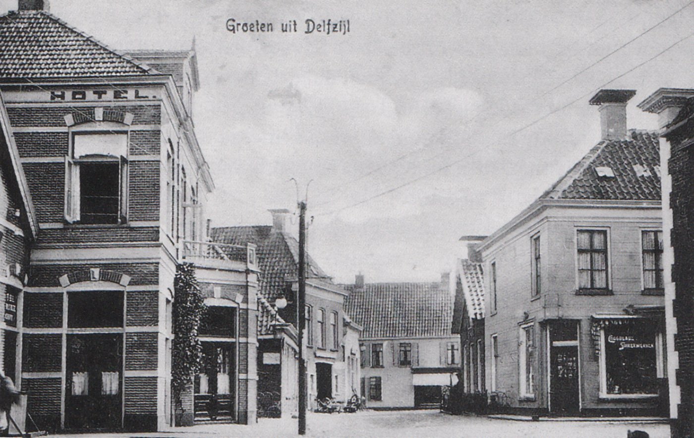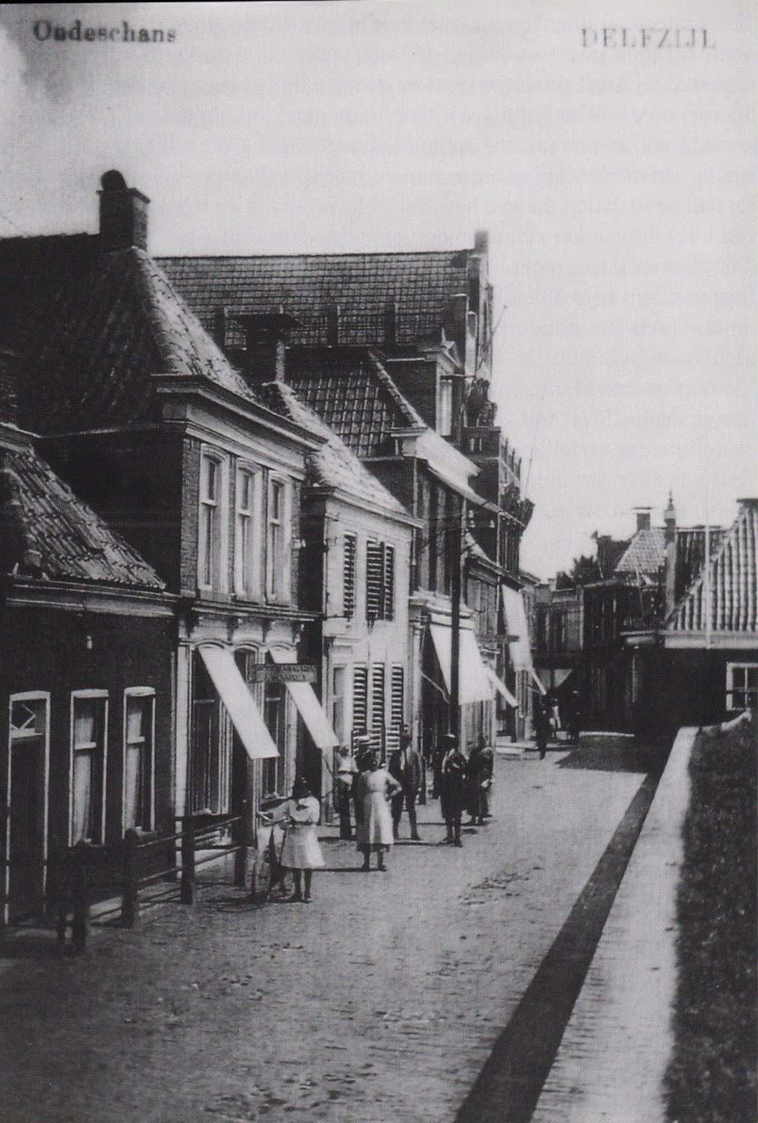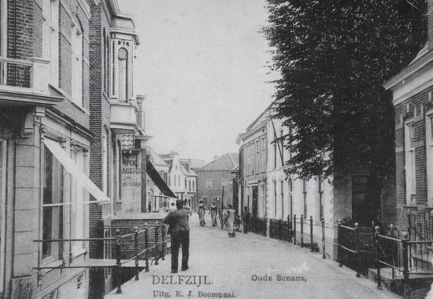 We staan nu op de kruising Kerkstraat en huidige Oude Schans. Rechts van ons bevindt zich het ‘Klein Poortje’, later Kleine Waterpoort, in de vesting wal, waardoor we een doorkijkje hebben naar de haven en naast ons, rechts op de hoek, de hervormde pastorie. Tot 1712 was dit het militaire comman- dement en hier maakte bijvoorbeeld admiraal Michiel Adriaansz. De Ruijter in 1666 zijn opwachting, toen hij op een retourreis van Indië de Eems opliep en op de rede van Delfzijl ankerde.