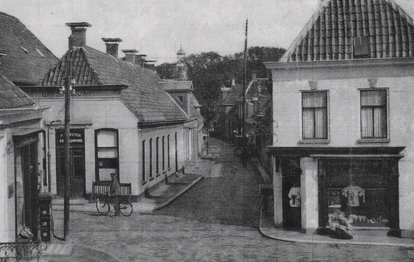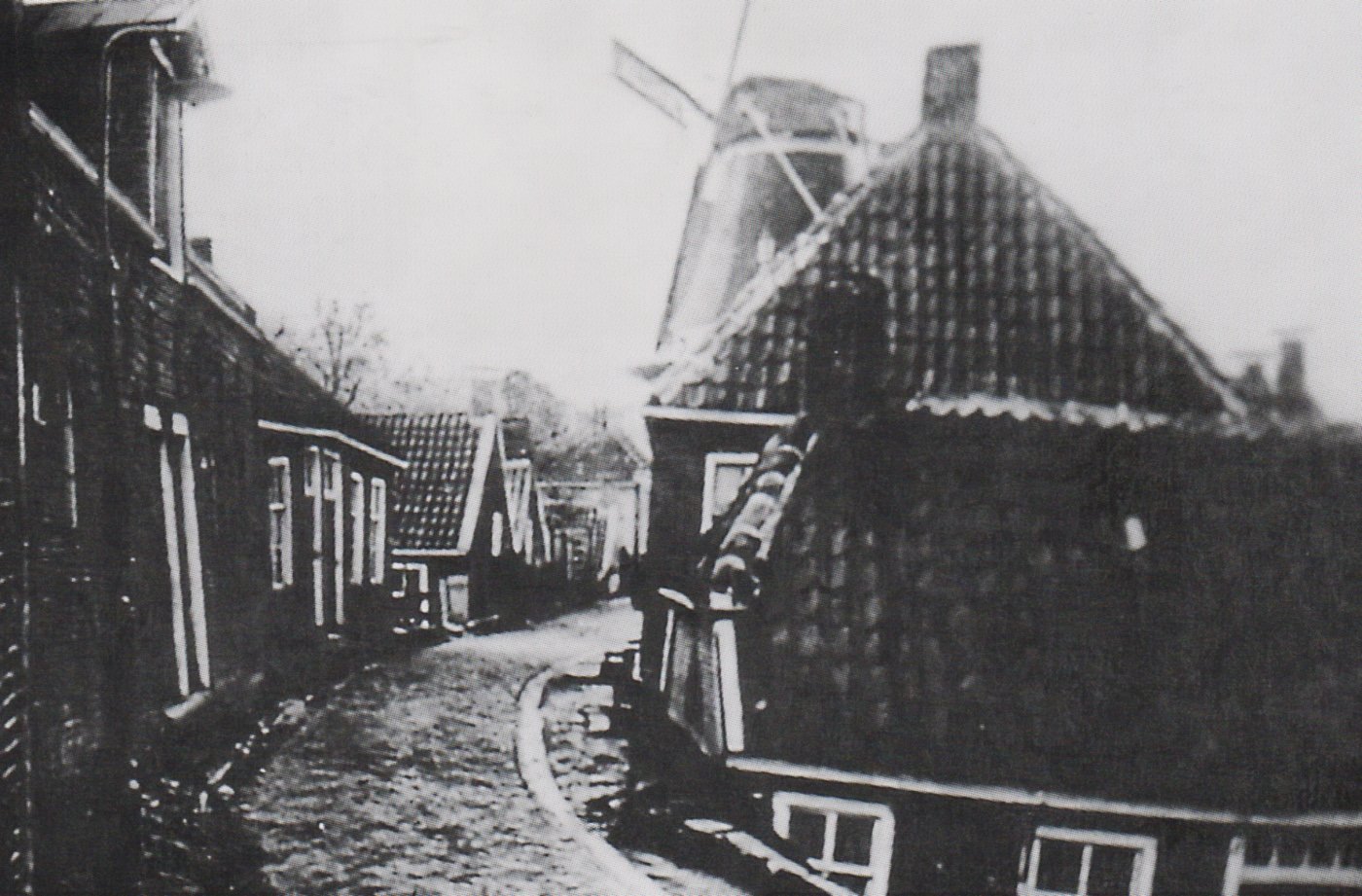 Als we de beide huizen aan onze rechterhand voorbij zijn, hebben we, tot aan de smederij, het muurtje van de wal waar ik zo-even al van sprak. Aan de andere kant van de straat zijn winkels, een kroegje en een gangetje dat naar de Gereformeerde kerk leidt. Nu krijgen we aan weerszijden weer huizen tot aan de stenen brug, die midden in de straat ligt. Dat is de Kakebrug en hier is weer de scheiding tussen de oude en de nieuwe schans.”