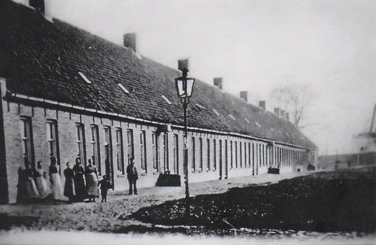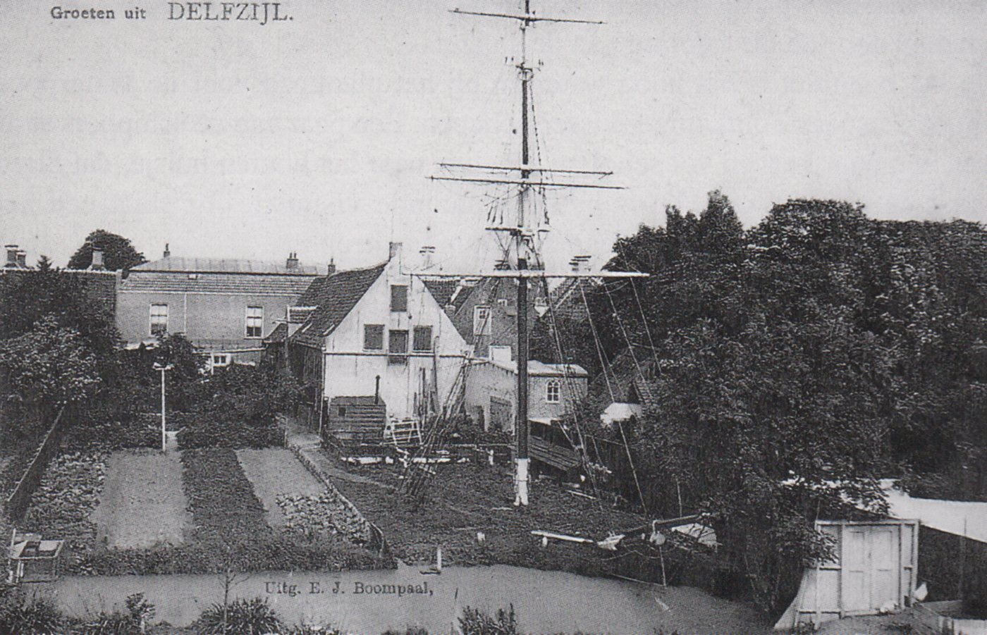 “We staan nu aan het einde van ‘de landstraat’ en kunnen die tot aan het andere eind doorkijken. Wij steken de straat over (laten de Landpoort dus ‘links liggen’) en komen weer bij de wal. Deze wal noemen ze ‘poaske wingelwaal, zeker omdat ze er tijdens Pasen altijd bezig zijn met notenschieten, een andere reden zou ik er tenminste niet voor weten. Langs een heel eind van de wal bevindt zich hier de lijnbaan van Leeuw. Het rad wordt gedraaid door Neele. Die is niet helemaal goed bij zijn verstand en gaat soms de boer op, of gaat bij schepen langs om om een beetje eten te vragen. Hij heeft dan een blikken soldatenketel bij zich. Het gebeurt wel eens dat hij zo veel krijgt, dat hij het niet in zijn keteltje kan bergen. Nou, dan doet hij de rest in zijn pet, alsof het groene erwten zijn. ‘Een stukje brood alstublieft’, is zijn gewone vraag op halfhuilende toon. De oude Jaap is aan het spinnen. Hij heeft een rol hennep om zijn lichaam gewonden, is aan het spinnen. Hoe meer hij achteruit gaat, hoe meer hij vooruit komt, want met achteruit lopen verdient hij de kost. Dat is nog een raadsel uit de oude doos. Aan het eind van de lijnbaan is een groot grasveld, ‘wingel’ noemen wij dat. En schilderachtig wordt daar aan de zijkant, tussen de bomen en het groen, een wit bepleisterd huisje zichtbaar, het ‘Hofke van Flora’. Wij verlaten de wal nu en lopen voor ‘de kleine kazerne’ langs: een gebouw met een stuk of tien kamers naast elkaar. In de eerste, met de tralies voor de ramen, is de provoost. Daarin moeten de soldaten die wat uitgevreten hebben een dag of meer brommen. In de volgende kamer is een soort militair hospitaal. Daarnaast woont een sergeant die getrouwd is en soms ook wel eens een commies. Enige kamers staan leeg en aan het eind is nu de touwpluizerij van de werkverschaffing. Voor de kleine kazerne ligt een stuk groenland. Daar worden de recruten op gedrild. Een eindje verderop staat ‘de grote kazerne’ , een behoorlijk gebouw met behoorlijk wat grote kamers. Hier wonen de soldaten, meestal ruim honderd man. Voor de kazerne ligt ‘de Vennen’. Zo heten de drie stukken land die zich uitstrekken van de kleine kazerne tot aan de lijnbaan van Borst, (de latere Lijnbaanstraat) die direct tegen de wal bij de Zoute Gracht ligt. Het is een leuk gezicht dat bijna midden in het verder zo dichtbebouwde Delfzijl koeien in het land lopen en het hooi er in oppers staat.”