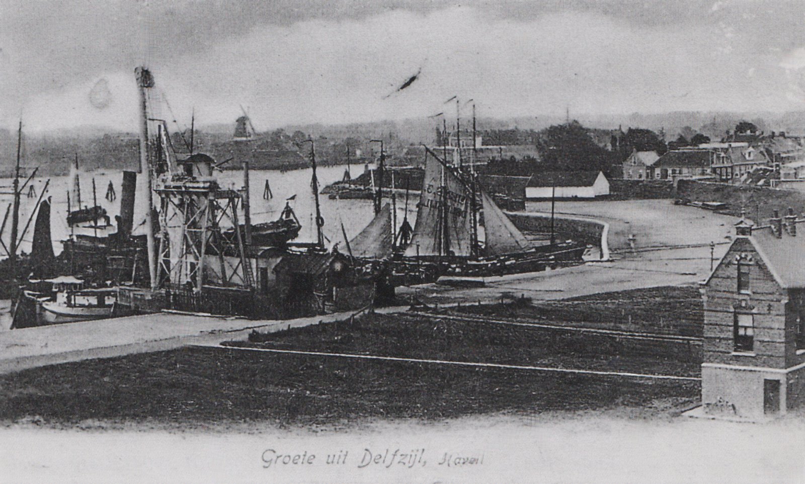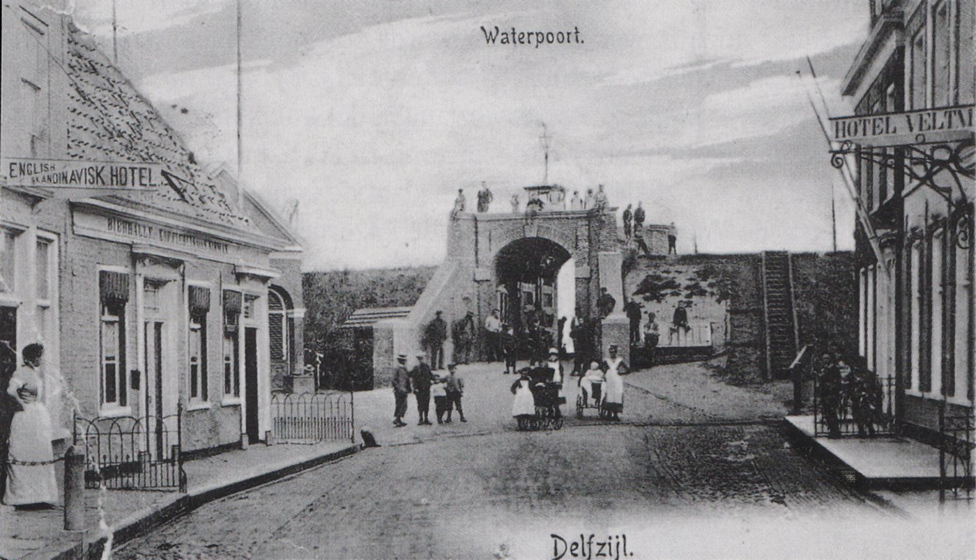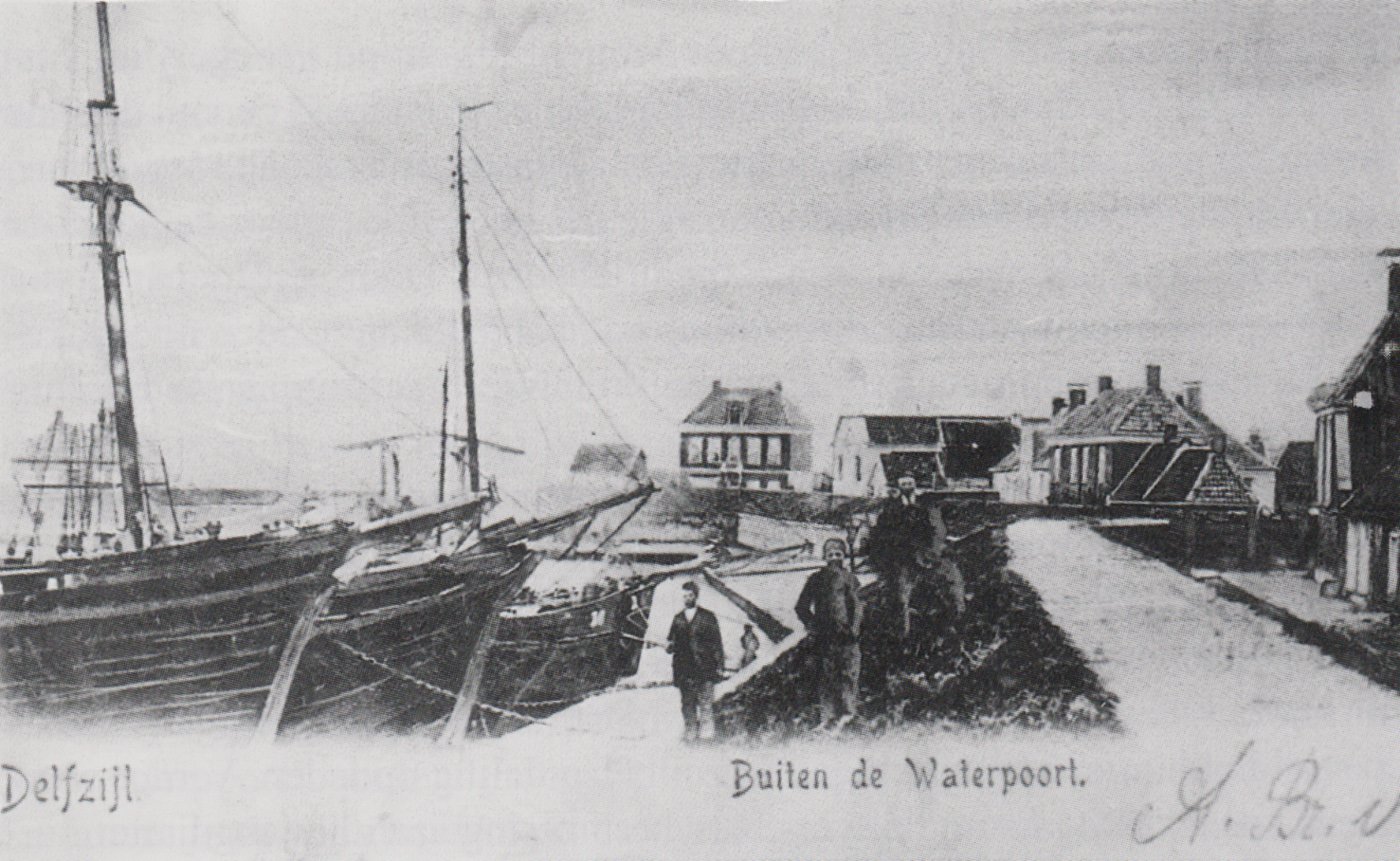 En het is voor ons geboren Delfzijlers moeilijk om er afscheid van te nemen. Ik wijs u nog even op het ‘Blokhuis’ (fortificatie met geschut ter hoogte van het huidige Eemshotel) dat verderop op de dijk staat, waarna wij onze weg over de wal vervolgen, richting Waterpoort. Vanaf de poort tot aan de zeedijk ligt (buitendijks) langs de haven een breed, stenen pad. Vroeger was dat een pad van planken op palen.