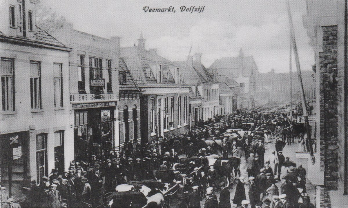Tegen het witte pakhuis staat een kraam met vijgen, rozijnen, amandelen en dergelijke dingen. De koopman, een donkere joodse man, is zo snel als water en als hij het druk heeft, vliegt hij van het ene eind van de kraam naar het andere en maakt daarbij bewegingen of hij kwik in zijn gat heeft. Hoor hem eens roepen: ‘Oh, wat heeft die Japie een lekkere vijgen! Vier centen voor een half pond.’ En tegen de kwajongens die graag overal met hun handen aanzitten: Blijf daar vanaf, jij met je groene haar, of ‘Wat achteruit, jij Poolse dame.’ Wat natuurlijk heel wat gelach oplevert. Bij het arsenaal heb je de grote galanteriekraam van Koorn. Hij draagt altijd een bruine duffelse jas en zwarte klompen. De meesten kopen bij hem als ze wat nodig hebben en je kunt het haast niet bedenken of hij heeft het. Hij kent haast iedere Delfzijler en weet niet waar hij het eerst en het laatst moet zijn. Een eindje verderop staat Mulder met zijn koekkraam. Grote koeken, met in suikerletters erop ‘uit liefde’,  ‘uit achting’ en zo, staan op planken waar een wit laken over ligt. Op de toonbank liggen hoopjes ‘doemkes, oelevellen en toije taissen’ enz. Mulder zegt niet veel, maar zijn vrouw des te meer. ‘Toe es vriend,’ zegt ze tegen een boerenarbeider, ‘toe, neem es een stukje koek mee naar huis, kijk eens, vol sukade, echte Groninger, en maar voor een kwartje. Kom eens ‘wichterdies’ (meisjes), koop eens een ons ulevelletjes voor een dubbeltje.’ En onder het gegiechel van de meisjes wegens de uitspraak kwaardien, dubbeldien en ulleveldies, want wij zeggen immers kwartje en dubbeltje, kopen ze ulevelletjes en per persoon een koek. Mevrouw Mulder lacht mee als ze haar plagen met haar ‘dubbeldien’. Als zij maar verkoopt, laat dat volkje dan maar om haar lachen. Vlak voor de hoofdwacht staat onze oude vriend ‘Werk’ met zijn oliebollenkraam. Hij zit voorin de kraam bij een groot vuur en bakt oliebollen, terwijl zijn vrouw haast zonder onderbreking volle bordjes de kamertjes insjouwt. Die zitten vol jongvolk, dat zich aan het lekkere gebak tegoed doet en er een borreltje bij drinkt. Ze zijn vrolijk, soms wel wat uitgelaten. De een zet in en de anderen zingen al gauw mee. En met kelen die met oliebollen en brandewijn gesmeerd zijn, klinkt ons haast brullend tegemoet: Daar was laatst een boerinnetje, al in het jeugdig groen’. Direct er tegenover staat een Jan Klasenspul (poppenkast). Er staat een hele drom volk bij dat met blijkbaar groot plezier luistert en kijkt naar de lotgevallen van Priempie en Galupijn. Verder naar de poort toe staan koek- en oliebollenkramen, koektafeltjes en enige met galanterieën. Ze staan twee rijen dik en dicht tegen elkaar aan. Wat achteraf staat een joodse man aan een tafeltje waar hij niks anders op heeft liggen als drie kaarten. Hij speelt het welbekende maar verboden spel ‘1, 2, 3, klaveraas’ . Een boerenknecht heeft zojuist een rijksdaalder aan hem verloren en loopt scheldend weg. Er komt juist een veldwachter aan. De man bergt gauw zijn kaarten weg, maar de wetsdienaar is nog maar nauwelijks uit het zicht verdwenen of het gaat al weer: 1, 2, 3, klaveraas. Op het tafeltje ernaast wordt een onschuldiger spel gespeeld. Ze gooien met drie dobbelstenen in een bak en zeggen dan ‘erboven’ of ‘eronder’; dat wil zeggen onder de negen ogen of boven de twaalf. Als ze hetzelfde gooien als ze van tevoren gezegd hebben, krijgen ze voor een paar centen een stuk koek. Als dat niet het geval is, krijgen ze voor hun twee centen helemaal niks. En dit soort dingen heb je meer. We zijn nu vlakbij de Waterpoort aanbeland en daarmee aan het eind van de kermis. Op de hoek van de Waterstraat staat een man bovenop een tafel en direct daarnaast staat een grote kist met koek. Z’n kameraad reikt hem steeds koek aan en hij vent die uit, terwijl hij het publiek met zijn praatjes bezighoudt. Hij vraagt eerst honderdduizend gulden voor de koek, maar zit al gauw op een kwartje. ‘Kwartje, kwartje, kwartje, nou dan, voor een dubbeltje, ik betaal de bakker toch niet. En nu komen de kopers in drommen naar voren dringen. Ertegenover heb je een voorstelling die voor een heleboel mensen erg aantrekkelijk is, die van de oude Albert Bakker. Hij heeft vier stokken in de grond staan, waaraan afbeeldingen op linnen bevestigd zijn en voor deze stellage staat Bakker bij zijn orgel. Aan weerskanten van hem staan zijn zoon en dochter, ieder met een viool. En zijn vrouw staat startklaar met in de ene hand een blikje en in de andere een pakje papier met liedjes erop. Zometeen gaat ze de omstanders langs om met het blikje centen op te halen en om de liedjes te verkopen. Daar klinkt de muziek van het orgel en de violen al en zingen de Bakkers het zo-even aangekondigde lied, dat nieuw, aandoénlijk en prachtig is, zoals Bakker beloofde: ‘In een groot paleis, midden in Parijs’. Het gaat over een jong meisje, een wees, dat in Parijs als keukenmeid bij een oude mevrouw diende. ‘In datzelfde huis, was een neef nog thuis, die als jong student, om zijn slimheid stond bekend’, gaat het lied verder. Die neef was een eersteklas losbol. Hij verleidt het meisje en wil later niets meer van haar weten. Zij vermoordt haar kind uit wanhoop, komt op het schavot en waarschuwt alle meisjes om zich toch niet met zulke deugnieten in te laten en zich aan hen te spiegelen. Op de platen aan de stokken zie je de verschillende delen van het verhaal ‘aanschouwelijk voorgesteld’, zoals Bakker zegt en hij wijst ze iedere keer met een rietje aan. Bakker en zijn familie doen hun best en de centen die moeder de vrouw ophaalt, zijn welverdiend. Dat de herbergen langzamerhand vollopen, kun je wel horen als je er langs loopt. Nu nog even buiten de Waterpoort kijken. De draaimolens zitten vol publiek en draaien om het hardst. Jongens en meisjes zitten onder het draaien een beetje te vrijen. Maar niet alleen jonge mensen, nee, ook oude mensen laten zich nog eens zo ronddraaien. En een ritje in de draaimole