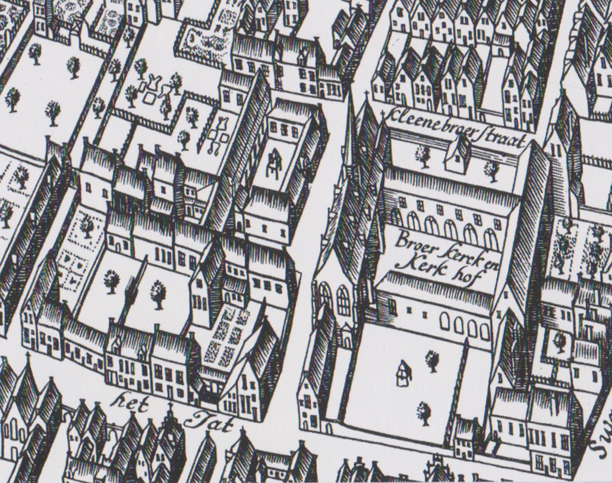 De Academie werd gehuisvest in de gebouwen van het geconfisqueerde Franciscanenklooster aan de Broerstraat, hier afgebeeld om de vogelvluchtkaart die