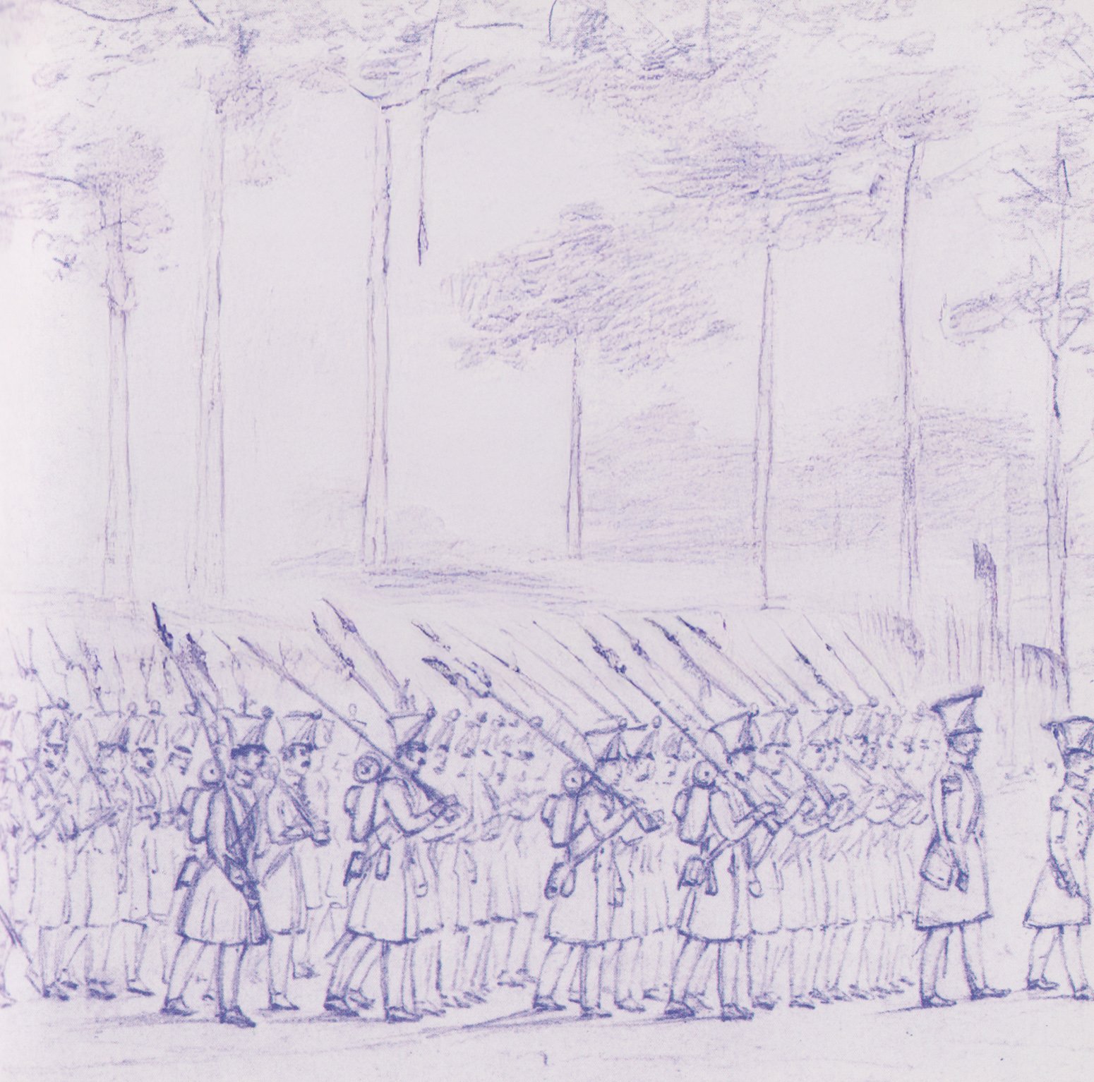 De tekening van de marcherende flankeurs is afkomstig uit het schetsboekje van