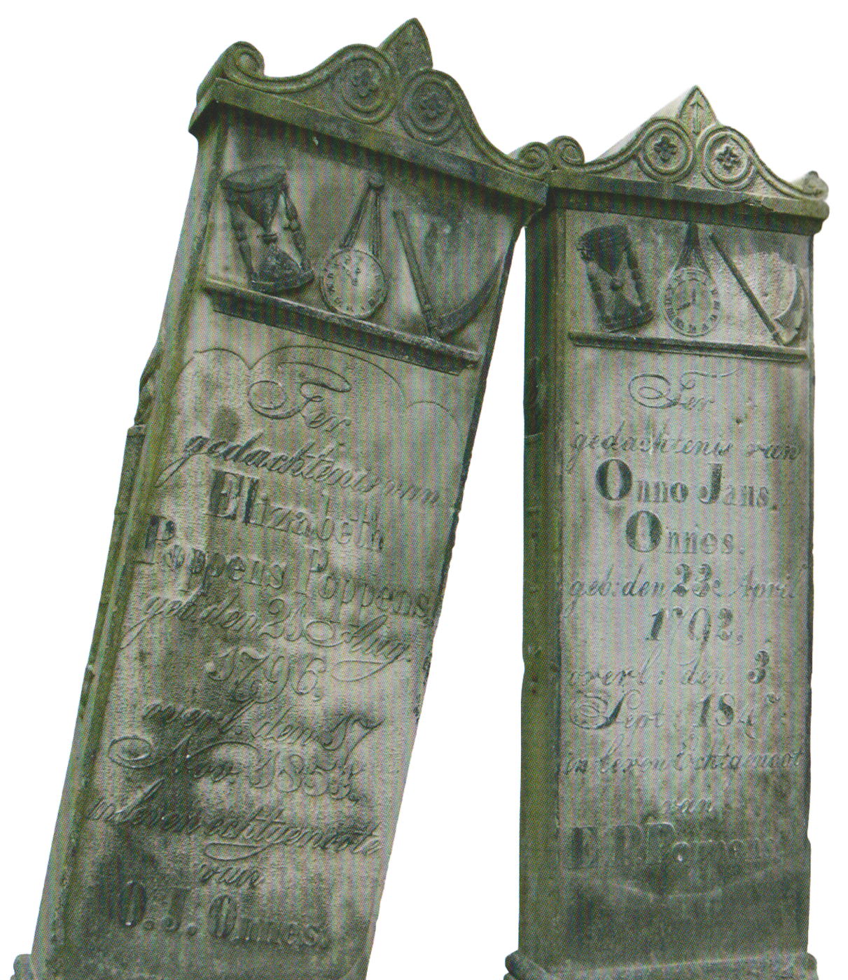 vorm aan ‘oet tied kommen’ Gronings voor sterven: de horloges laten het tijdstip van overlijden zien. De afgebeelde zandloper en de zeis symboliseren het verstrijken van de tijd en het afgesneden leven. Zelfs de zijkanten van de stenen zijn gedecoreerd, met een brandende toorts en een omgekeerde, dovende fakkel.