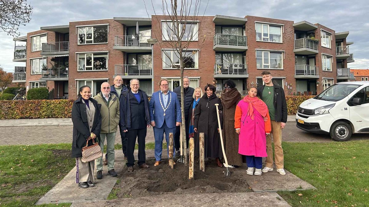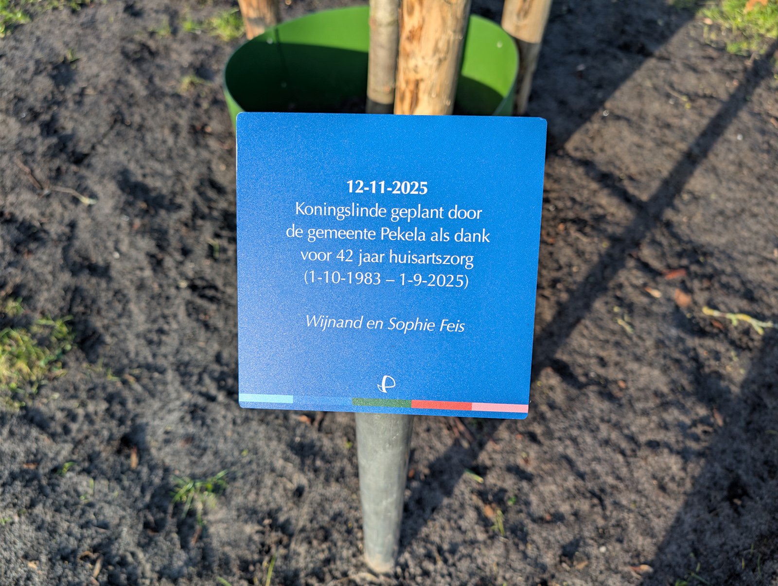 OUDE PEKELA – In het park naast het gemeentehuis in Oude Pekela is woensdag 12 november 2025 een koningslinde geplant, ter ere van het werk van huisarts Feis.